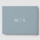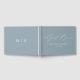 Elégant livre d'or de mariage avec "Guest Book" présenté dans un script moderne de calligraphie blanche sur un arrière - plan bleu poussiéreux. Personnalisez l'avant du simple livre d'hôtes mariage avec vos noms et votre date de mariage. L'arrière du livre d'hôtes bleu poussiéreux affiche vos initiales monogrammes. Ajoutez votre nom et votre date de mariage à la colonne vertébrale du livre d'or.