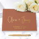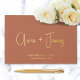 Ce livre d'hôtes mariage en terre cuite minimaliste et élégant comprend de la feuille d'or véritable, vos noms dans un script moderne chic, ainsi que votre date et votre emplacement mariage dans la typographie serif classique. Vous pouvez personnaliser le titre sur la colonne vertébrale et ajouter votre photo préférée au dos.
