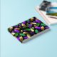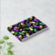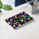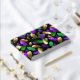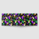 Seamless pattern of bright purple, green, and gold feathers on black Mardi Gras background. Design for the Mardi Gras holiday.