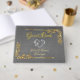Silver Heart on Grey with Gold Border Guest Book features an intricate silver scroll heart and gold leaves border on a grey background. Room to place the couple's name on the front and names and date on the spine. (Ribbon is simulated in the artwork). Designed to coordinate with the "Elegant Marble, Gold Frame & Heart" Wedding Collection. To change details, click «Personalize». To move the text or change the text size, font, or color click «Click to customize further»