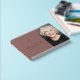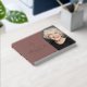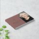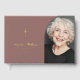 Livre d'or funéraire commémoratif avec une photo à l'intérieur d'une demi-arche et une simple croix chrétienne.