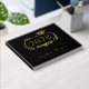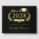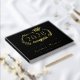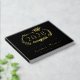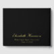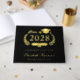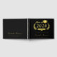 Élégant livre d'invité de la fête de graduation noire avec une véritable feuille d'or, "Classe de" dans une illustration de couronne de laurier incorporant un casquette et un diplôme, le nom du diplômé dans un script formel, et "Félicitations" et leur nom d'école dans la typographie serif classique. Personnalisez le texte supplémentaire sur la colonne vertébrale et le dos.
