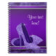 Cahier spiralé en forme de chaussure à talon haut avec de jolies chaussures violettes sur un beau fond violet et argent. Ce cahier de chaussures à talon haut violet est idéal comme livre d'or pour une fête et un enregistreur de cadeaux pour faciliter l'envoi de cartes de remerciement. Personnalisez-le pour votre événement avec du texte dans le style de police de votre choix. Il s'agit d'une conception imprimée sans véritable paillettes, étincelles, etc.