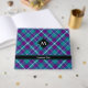 Design écossais vert mer, violet et bleu. Motif sans couture. Texte et monogramme personnalisés.