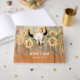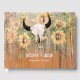 Ce livre d'or de mariage floral occidental rustique avec tournesols jaunes pour les jeunes mariés présente une texture country avec un crâne de taureau de rodéo aux cornes. Bois de grange vintage marron jaune vert. Style de fille de ferme cow-girl. Image copyright Marg Seregelyi Photographie.