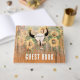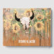 Des tournesols à fleurs rustiques de l'ouest mariage jaune tiennent un livre d'or pour le couple nouvellement marié. Rodéo cowboy taureau crâne avec cornes texture pays. Bois de grange vert brun vintage. Design de style vaches de ferme. Recherchez les produits correspondants dans cette collection. Copyright de l'image Marg Seregelyi Photography.