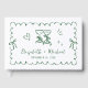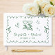 Romantic wedding guest book featuring a green scalloped wavy frame adorned with coquette bows, whimsical hand drawn illustrations of a heart, stars and wine glasses, and the names of the bride and groom in a playful green script.