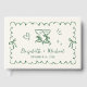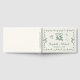 Romantic light cream wedding guest book featuring a green wavy frame adorned with coquette bows, whimsical hand drawn illustrations of a heart, stars and wine glasses, and the names of the bride and groom in a playful green script.