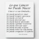 Ce cancer ne peut pas faire poème apparaît dans beaucoup de l'art DonnaBellas Angels. D'après les recherches en ligne, le plus qui a été trouvé sur l'auteur original a été qui est supposément apparu pour la première fois dans les années 1960 dans une colonne Ann Landers. Lo que cáncer no puede hacer Cáncer es tan limitado... No puede paralizar amor No puede romper esperanza No puede corroer fe No puede destruir paz No puede matar amistades No puede suprimir memorias No puede silenciar valor No puede invadir el alma No puede robar la vida ternea No puede conquistar el espíritu -Autor desconocido