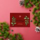 Classy moderne horizontale heureux vacances entreprises à la fois imprimé latéral carte de voeux plat avec un endroit pour votre logo avec élégante aquarelle classique feuilles de noël et vrai doré cadre pressé et heureux vacances texte sur un arrière - plan rouge bordeaux classe, le design moderne donnera à vos clients l'impression de luxe et de succès. Le côté arrière a un libellé personnalisé. Ce modèle de carte Happy Holidays est prêt pour votre personnalisation en ligne. La feuille d'or peut être changée en or ou argent rose.