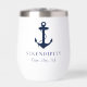 Une tumble thermique classique à thème nautique pour votre bateau qui présente une illustration bleu marine traditionnelle d'une ancre et d'une corde que vous pouvez garder ou remplacer par le logo de votre bateau. Personnalisez avec le nom et l'emplacement de votre bateau dans élégant script bleu marine et typographie.