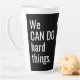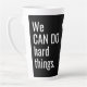 Logo promotionnel Latte Mug Business No Minimum. Nous Pouvons Faire Des Choses Dures Citer Le Logo De L'Entreprise Latte Mug. Étendez-vous dans une mer de tasses à café avec votre tall tall mug ! Personnalisé avec votre entreprise ou logo de petite entreprise ou d'entreprise ou pour votre équipe, équipe sportive ou groupe bénévole sans but lucratif. Typographie moderne en lettrage blanc sur arrière - plan noir. Un cadeau parfait pour vos équipes ou en tant que produit de marketing promotionnel ou un cadeau pour vos clients, clients ou prospects. Citation inspirante des deux côtés. Votre logo entre eux. Le logo peut être supprimé si vous le souhaitez. Faites-leur savoir votre équipe CAN ! Step by Step Inspiration Series disponible exclusivement sur Zazzle à l'adresse zazzle.com/store/KrisHarty, conçu par le designer international Kris Harty. © 2020 Kris Harty Inspiration pas à pas
