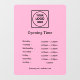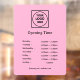 Montrez vos heures d'affaires avec style grâce à ce logo personnalisé rose. Parfait pour les bureaux, les magasins ou les restaurants, cet affichage professionnel permet à votre logo d'entreprise et les horaires d'ouverture de se démarquer. Élégante, attrayante et marquée, idéale pour créer une impression de vitrine polie.