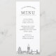 Menus culinaires personnalisés pour votre prochain événement sur le thème du mariage dans la belle ville de Londres. Il présente une illustration de style déco de l'horizon urbain. Vous trouverez ci-dessus des points pour obtenir des informations uniques et des informations sur le menu des événements. À l'envers, une couleur gris nickel avec un espace pour votre propre message unique à vos invités mariages.