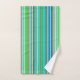 Cet ensemble coloré de serviette de bain est décoré d'un motif animé de vert, d'or, d'orange, de bleu, de turquoise et de rayures verticales blanches.