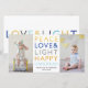 Festive Hanoukka Holiday carte de voeux photo avec une conception typographique des salutations populaires Hanoukka dans les tons classiques des couleurs Hanoukka de bleu, gris et or. Ajoutez vos photos préférées et personnalisez avec votre texte personnalisé. C'est une partie d'une collection de vacances "LOVE & LIGHT TYPOGRAPHY". Des articles complémentaires sont disponibles. COULEUR ARRIÈRE - PLAN peut être modifiée avec zazzle arrière - plan options de couleur outil en ligne
