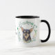 "LOVE MY CHIHUAHUA" déclare cette tasse pour le propriétaire du Chihuahua. Chaque côté de la tasse a un beau portrait aquarelle d'un Chihuahua noir et bronzé dans une couronne de feuilles bleues vertes. Entre les deux images est le texte, qui peut être facilement customisé, ou même supprimé, par vous.