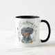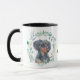 "LOVE MY DOXIE" déclare cette tasse pour l'Amoureux des chiens Dachshund. Chaque côté de la tasse a un beau portrait d'aquarelle d'un Dachshund noir et bronzé dans une couronne de feuilles vertes bleues. Entre les deux images est le texte, qui peut être facilement customisé, ou même supprimé, par vous.