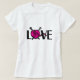 T-shirt tricot d'amour. Avec une boule de laine en forme de coeur à la place du o dans le mot amour. Un t-shirt mignon idéal pour les tricoteurs et les groupes de tricots. Graphiques originaux de Sarah Trett.