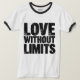 Un T-shirt design avec un arrière - plan blanc disant "Amour sans limites" dans le style audacieux, police de Géorgie vintage avec des bords en détresse.