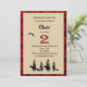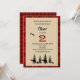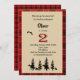Une invitation à la fête à thème bûcheron pour la fête du deuxième anniversaire d'un garçon. Modèles pour le nom et les détails de la fête. Tartan rouge et noir, motif de flanelle plaid, silhoettes de forêt et faune en noir. Arbres, orignaux, lapin, renard et aigle. Numéro 2 année en motif plaid. Arrière - plan marron clair, beige. Lettres noires.