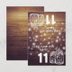 Modèles de carte d'escorte / numéro de table / place de siège de mariage - Élégant pot de maçon et lumières de ficelle sur fond de bois rustique.