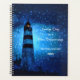 Un phare une nuit orageuse avec nuages foncés et pluie. Une faible lumière se découvre dans la tour du phare. Image bleu foncé recouverte de gouttes comme des gouttes de pluie ou des vaporisateurs océaniques. Le phare, symbole d'espoir dans les nuits les plus sombres, de guidage, de direction et d'aide. Un voyage sûr. Avec la citation motivationnelle : Chaque jour est un nouveau commencement. Personnalisez et ajoutez un nom et une année. Lettres blanches.