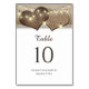 Cartes de numéro de table de campagne rustique avec deux coeurs de toile de jute sur un fond de toile de jute et de dentelle orné de lumières de chaîne.