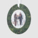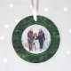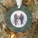 Cet ornement moderne de Noël est orné d'un riche arrière - plan vert émeraude foncé avec d'élégantes lumières de fées en faux or, et deux de vos photos personnelles préférées. Ajoutez votre nom de famille dans un texte de couleur or.