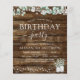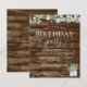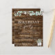 Cartons d'Invitation à un Anniversaire de Printemps, Eté, Automne ou Hiver à Thème Rustique Campagnard en Plein Air sur Bois Sombre avec Feuillage, Eucalyptus et Coton dans des Pots sur une Guirlande Lumineuse - comprend une belle et élégante typographie script pour la célébration spéciale de l'anniversaire.