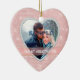 Cet élégant ornement présente votre photo spéciale dans un cadre en forme de coeur de diamant contre un joli bijou comme un arrière - plan rose plus clair avec de minuscules lumières étoiles. Votre texte est en blanc sur une bannière rose pâle encadrée en or. L'arrière de l'ornement a un champ blanc en forme de coeur avec plus de champs de texte pour vous de customiser. Un beau souvenir pour cette très importante première Saint-Valentin !