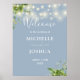 Cet élégant panneau d'accueil mariage bleu poussiéreux à cordes vert eucalyptus peut être personnalisé avec vos informations dans la typographie chic. Conçu par Thisisnotme©