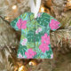 Magenta Rose, À feuillage persistant, Lime et couleur turquoise. Des fleurs d'Hibiscus et de plumeria dansent sur fond de monstère et de palmiers feuilles. Ces fleurs sont couramment utilisées dans les vêtements pour chemise aloha et muu muus, créant un design qui rappelle les estampes hawaïennes des les années 50 et des années 60.