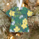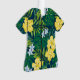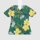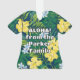 Jaune, À feuillage persistant, Chaux, Bleu et Navy Colorway. Des fleurs d'Hibiscus et de plumeria dansent sur fond de monstère et de palmiers feuilles. Ces fleurs sont couramment utilisées dans les vêtements pour chemise aloha et muu muus, créant un design qui rappelle les estampes hawaïennes des les années 50 et des années 60.