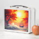 Cette boîte à lunch a un bateau au coucher du soleil dessus.