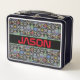 Cette boîte à lunch en métal réutilisable a une impression Motif de Sweater tricoté Alien Fair Isle Cute. Le motif est de cercles gris et noirs et de bandes de diamants. Chaque forme a des motifs aliens mignons rétro différents. Vous avez un mignon robot rétro, un enlèvement d'ovni, un vaisseau spatial avec un alien vert, une tête d'alien gris, un système solaire, un plante alien, un pistolet à rayons rétro et un chasseur étoilé. Entre les motifs se trouvent les lunes, et les étoiles. Vous pouvez rendre le motif plus grand ou plus petit. Personnalisez-le avec votre propre nom ou enlevez le nom et la barre pour n'avoir qu'un motif.