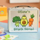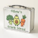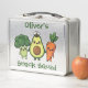 Cette boîte à lunch personnalisée pour enfants charmante présente trois personnages de légumes adorables se tenant la main. Un brocoli souriant agite la main, un avocat heureux porte un chapeau de capitaine et une carotte joyeuse se tient à ses côtés, avec la phrase "Équipe de collations".