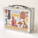 Cette lunchbox est prête à être personnalisée avec un nom en lettres bleu clair à l'intérieur et cadre de style cartouche égyptien. Le nom est entouré d'un collage de graphiques inspirés de l'Egypte ancienne. Mes illustrations représentent le dieu Thoth, la déesse du chat Bastet, le scarabée sacré, le signe de vie, la reine Nefertiti, le roi Tut, Anubis et plus encore. Les illustrations sont dans les tons bleu, orange, rouge, jaune et marron sur cette tasse argentée. Le nom apparaît à l'avant de la lunchbox tandis que les graphiques sont de part et d'autre.