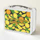Tranches orange et feuilles. Motif sans couture. Couleur arrière - plan personnalisée. Texte personnalisé de chaque côté.