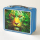 Cette boîte à lunch a un lion d'art dessus.