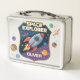 Cette boîte à lunch en métal personnalisée et ludique comprend un badge d'explorateur d'espace audacieux et dynamique. Au centre de l'insigne se trouve une roquette de dessin animé joueuse qui s'envole dans l'espace avec des planètes en orbite autour.