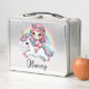 Cette joyeuse boîte à lunch en métal personnalisée présente une charmante petite fille sur une licorne avec un arc-en-ciel dans l'arrière - plan.