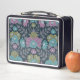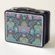 Cette boîte à lunch présente des fleurs dans les tons violet, bleu et vert olive, entourées de frondes de fougères violettes muettes et de feuilles sur un arrière - plan bleu foncé.