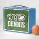Boîte à lunch pour enfants avec imprimé sport de rugby personnalisé. Boîte à lunch en métal de style rétro avec nom d'enfant. Idées cadeaux personnalisées pour les petits garçons allant à la maternelle et à l'école maternelle. Vieille école brillante lunchbox métallique avec poignée. Idée cadeau d'anniversaire mignonne ou de vacances pour fils, petit-fils, neveu etc. Ajoutez votre propre nom, vos initiales monographiques ou votre citation amusante. Dessin de balle sportive avec couleur arrière - plan personnalisée. Disponible en vert, bleu, rouge, noir et autres couleurs. Typographie sportive.