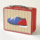 Créez un accessoire personnalisé qui est parfait pour votre bowler préféré. Cette lunchbox est prête à être personnalisée avec un nom en lettres de caractères bleus et présente des illustrations d'une boule de bowling et des épingles de bowling. L'envers a une illustration de coordination d'une chaussure de bowling.