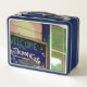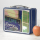 L'œuvre d'art sur cette boîte à lunch est une photographie originale de ZoeSPEAK représentant un enseigne de café rustique et une fenêtre à l'extérieur du café rural. C'est un panneau coloré, peint à la main avec des lettres vertes, blanches et bleues et des notes de musique sur un fond sombre, dans un cadre en bois. L'enseigne est accrochée à un mur en planches à clin de couleur jaune pâle avec des ombres roses, à côté d'une fenêtre avec des stores vert clair accrochés à l'intérieur, et une zone de surbrillance blanche reflétant des branches d'arbre.