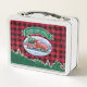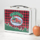 Ce design de vacances présente une scène hivernale d'un pick-up rouge classique qui traverse la neige, un arbre de Noël frais dans le dos. Sur la bannière verte ci-dessus on peut lire "Joyeux Noël". Arrière - plan est un motif à chèques de buffle rouge et noir. Conçu par un artiste de renommée mondiale © Tim Coffey.