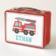 Emballez les repas des petits pompiers dans cette lunchbox qui a ce mignon camion de feu rouge qui a des rayures blanches sur son côté et une échelle rétractable avec tuyau. Palette de couleur rouge, bleu, gris et blanc. Personnalisez avec le nom de l'enfant. Idéal pour les enfants, surtout les garçons, qui aiment les jouets de véhicules et les moteurs à incendie!