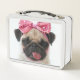 Chien Carlin avec la langue avec un ruban rose paillé, arrière - plan blanc.