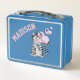 Une mignonne boîte à lunch bleue pour les enfants (garçons ou filles) avec un chat tabby gris et noir envoyant des câlins et des baisers. Utilisez le modèle pour le personnaliser avec le nom de votre enfant. N'hésitez pas à modifier la couleur de la police ou de la police elle-même si vous le souhaitez. © ArianeC Illustrations
